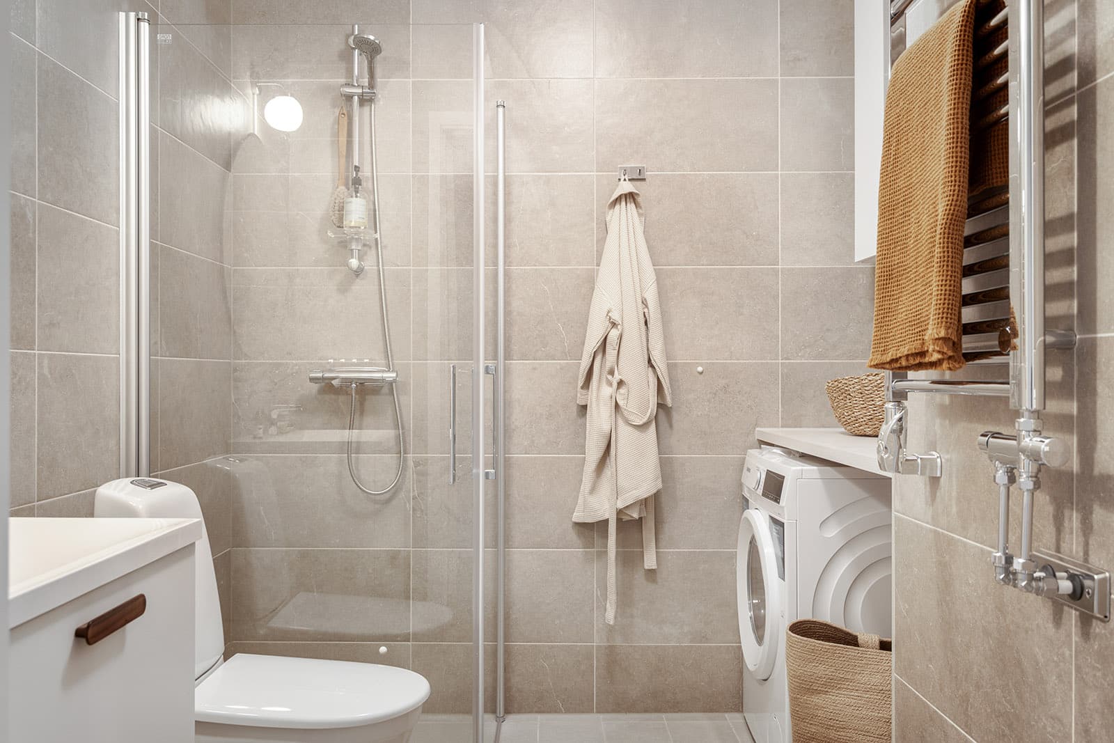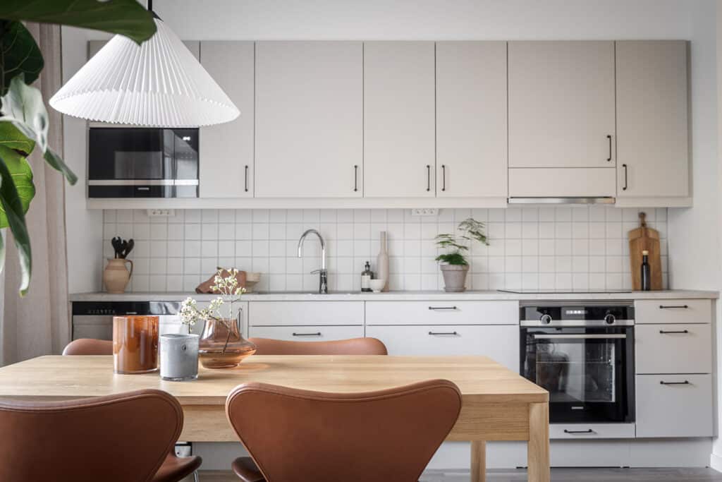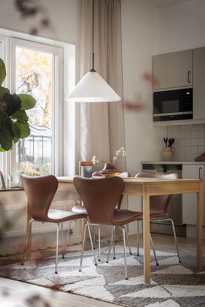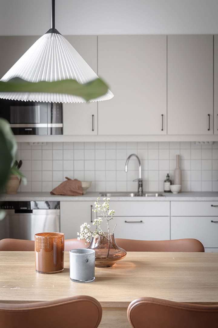 En lugn färgskala med silkesvit bas, kompletterad med beige, grönt och brunt. Accenter i bronstoner och mörkt trä ger ett sofistikerat uttryck. En enhetlig känsla där både kök och badrum är lika ombonade som övriga rum. Tidlösa tapetmönster med växter, ränder och marmorering.