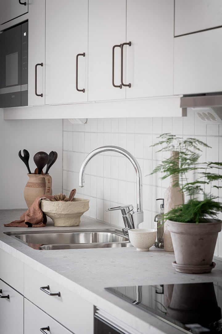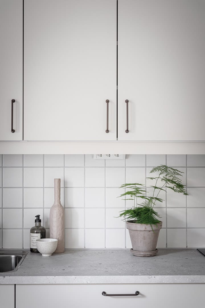 Ett minimalistiskt, grafiskt uttryck i svartvitt och rostfritt, men med inslag av naturmaterial. Den robusta, industriella designen håller för skiftande trender och det liv som levs i bostaden. En neutral bas som, med samtida energi, ger utrymme för personliga uttryck.